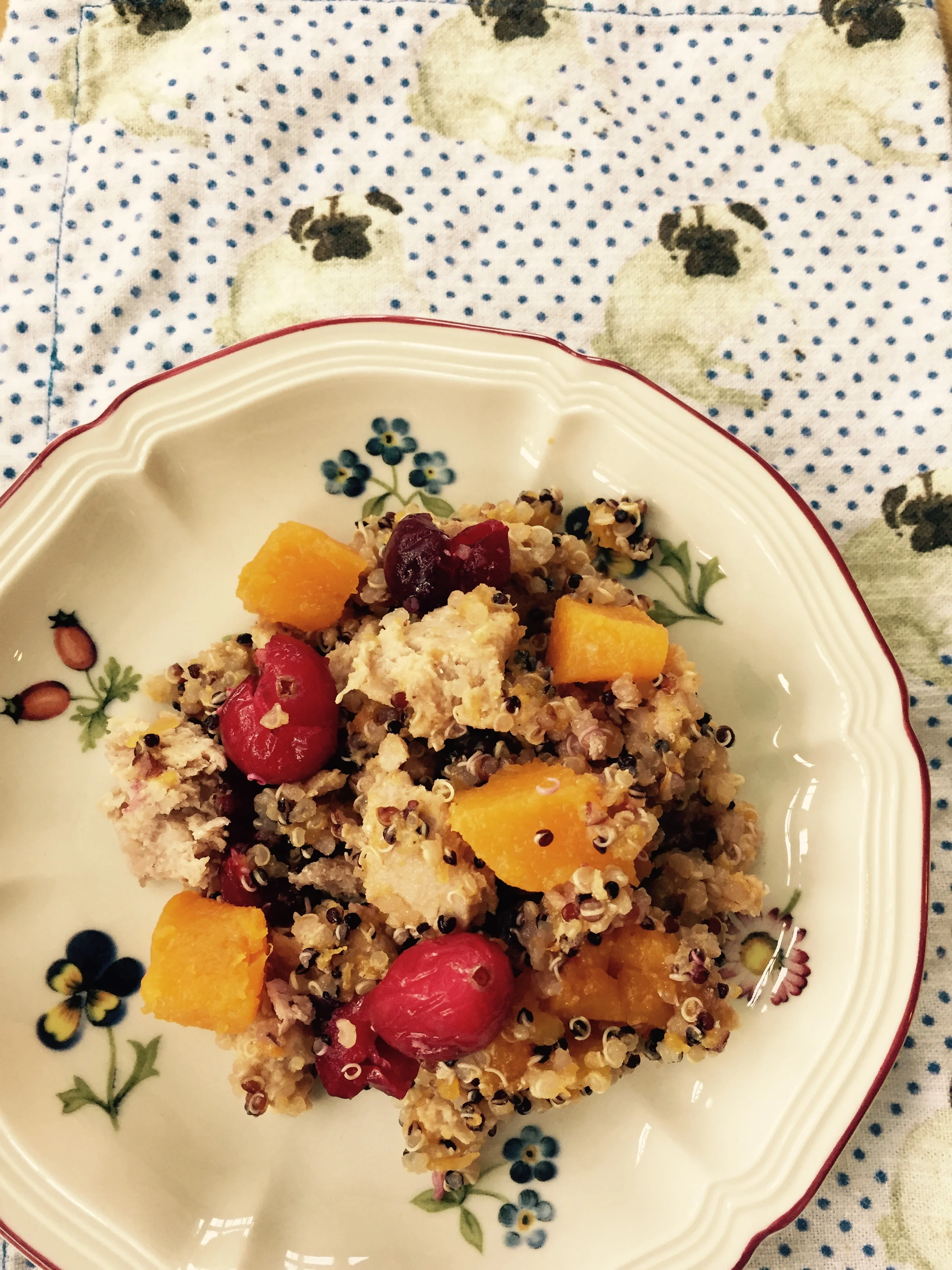 Baked-until-soft butternut squash (without the skin), and one morsel of Turkey liver cooked with a few crushed cranberries. Drizzle the butternut squash with the broth.